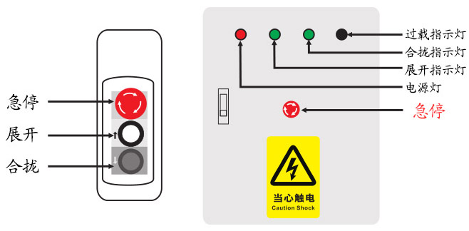 注:手柄開關使用方法為點動。長按合攏按鈕即可合攏,當看臺徹底合攏時,觸碰到限位開關會自動停止。